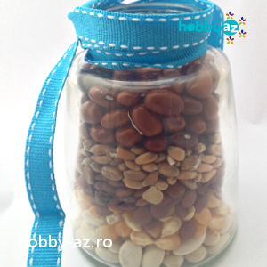 Materiale: Sticle de diferite mărimi, forme sau dimensiuni, semințe porumb, grâu, fasole, linte, orez, pânză, ață, respectiv material pentru gura sticlei sau …