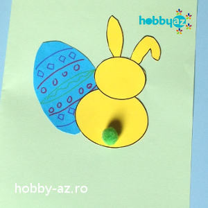 Materiale: coli colorate, pompoane, foarfecă, lipici Pașii de lucru: Scoți la imprimantă modelul cu iepurași pe o coală colorată. Decupezi iepurașii. Pliezi …